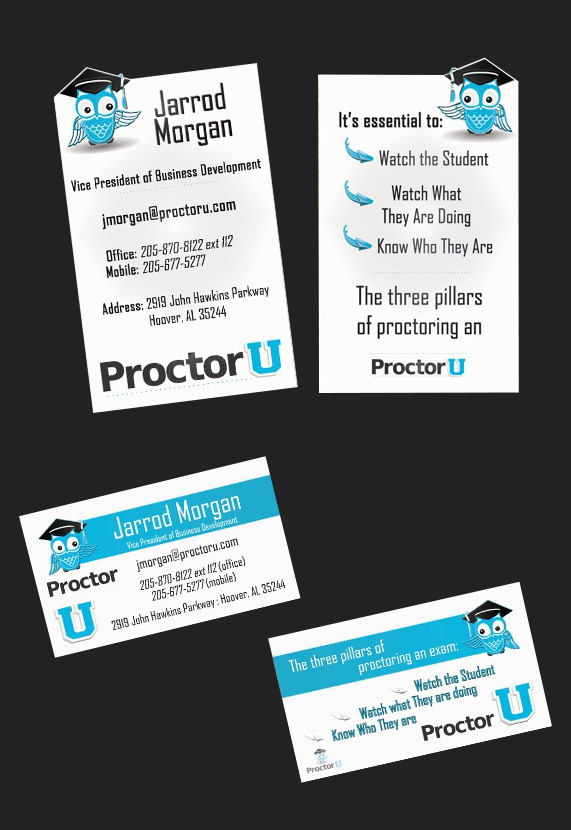 Sleek, cool looking business cards that play on our logo. We would also like a back side to the card. The back of the card should play on the three pillars of proctoring an exam... (Watch The Student - Watch What They Are Doing - Know Who They Are).