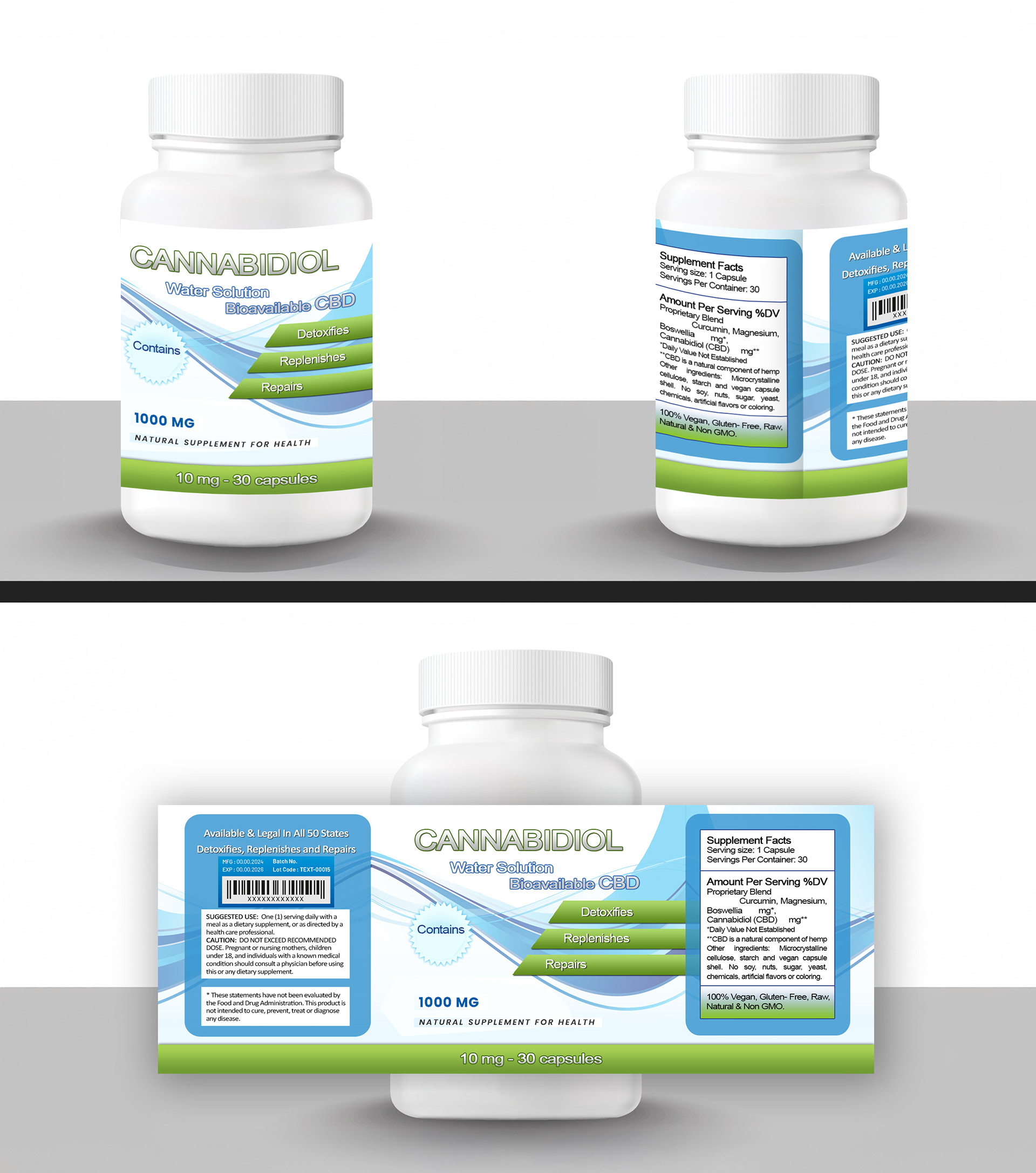 Clean, cutting edge label design for a capsule bottle. Fitting for multiple products, a label that will support a full product line by allowing for design variations.