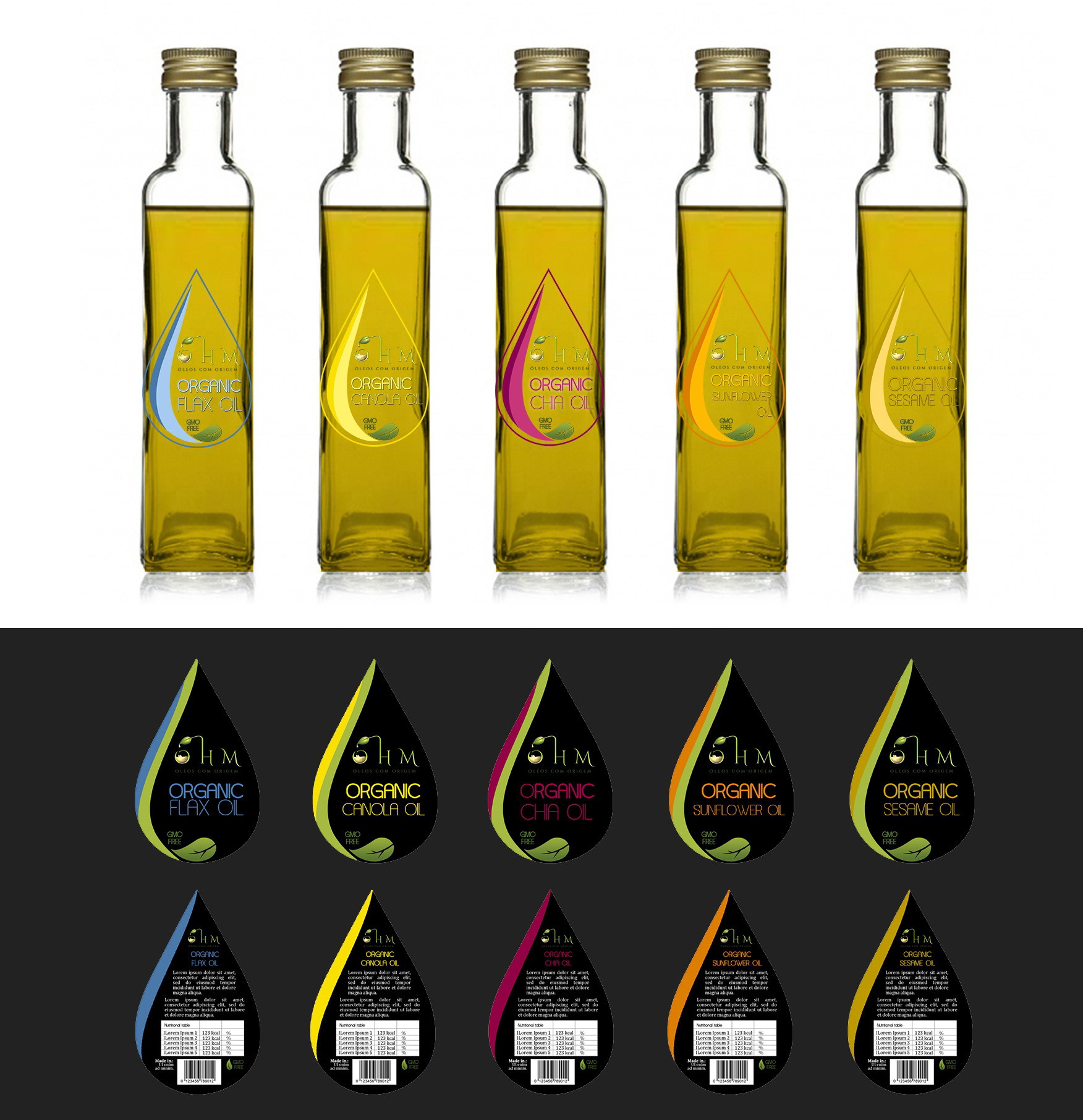 Label for a new line of extra-virgin vegetable oils to be packed in 250ml containers. This product is called "ohm". Elegant design, with few colors, impactful. The oils are: chia, sunflower, canola, flax, sesame. All are gmo-free.