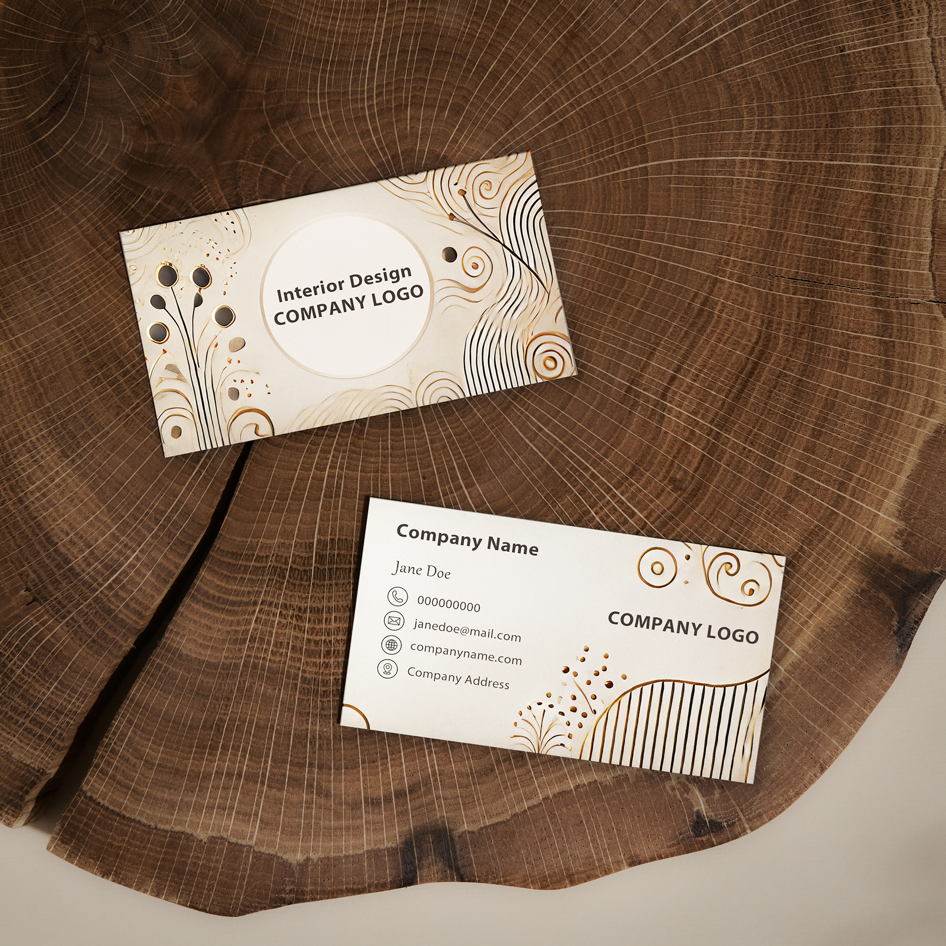Mockup for a basic business card design, with neutral color scheme and hand drawn decorative design, printed with gold accents.