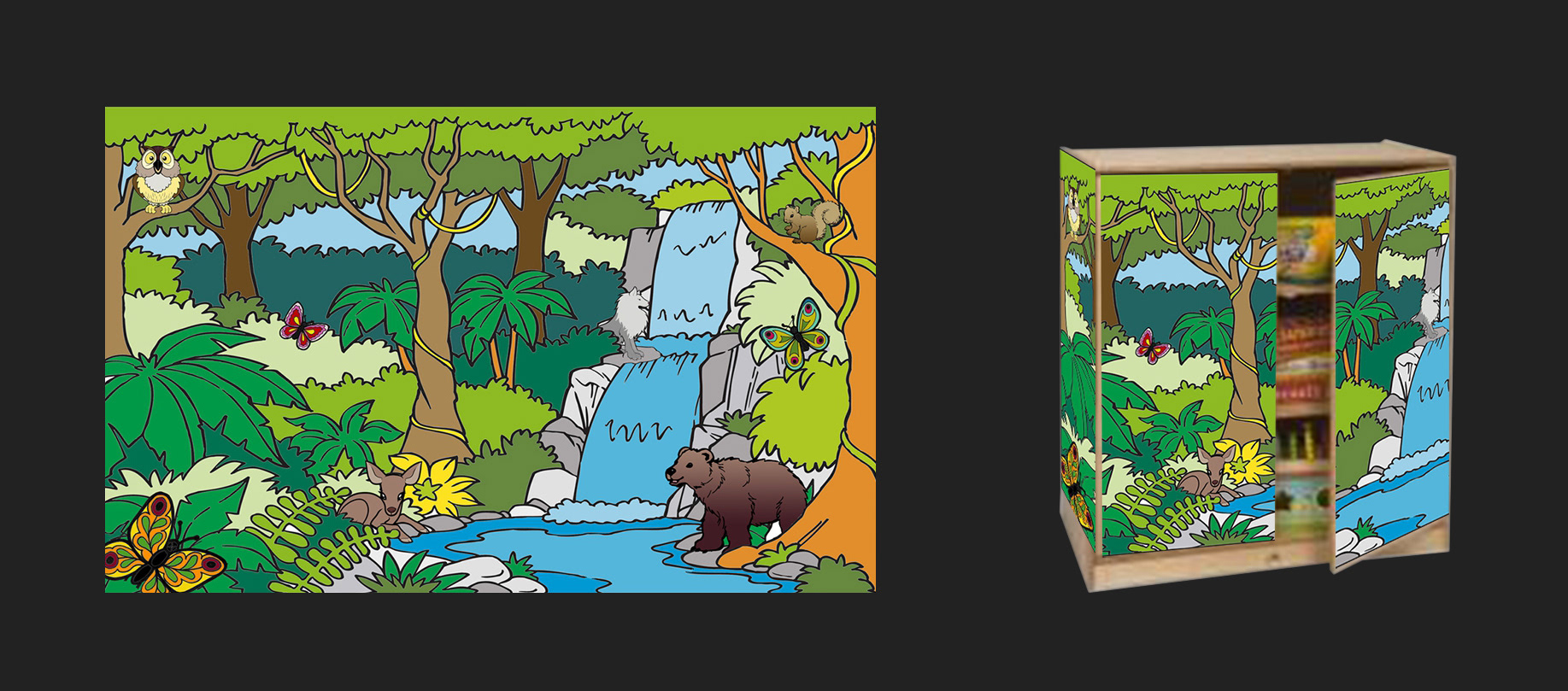 Designs to apply to manufacturers cabinets that would be appropriate and attractive to children, to have slight educational purposes. Below example is for a game of finding forest animals and naming them.